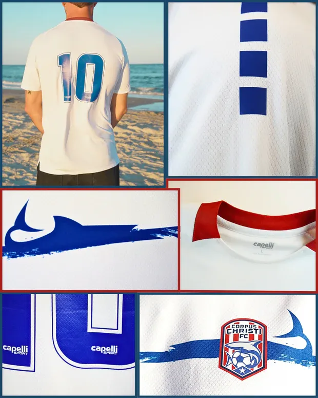 A simple white kit with blue horizontal stripes, with sharks in the stripes. A unique pattern representing the Sharks mentality, Coastal Bend roots and solidarity with our community is the perfect storm. A kit fit for fans to wear at any match.